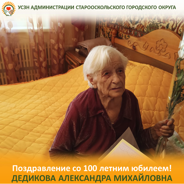 Александре Михайловне были вручены поздравления от президента РФ Владимира Путина, памятный подарок и пожелания крепкого здоровья и долгих лет жизни. За чашкой чая юбиляр поделилась секретами долголетия и рассказала о своем трудовой жизненном пути.Дедикова А.М. родилась с. Хреновое, Воронежской области. Свою трудовую деятельность начала с работы в колхозе, в дальнейшем воспитателем в детском саду. Своего супруга Александра Михайловна встретила в военные годы. Они прожили счастливую жизнь. Сегодня у Александры Михайловны 3 детей, 4 внуков и 2 правнука.