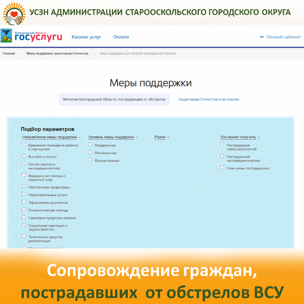 В рамках реализации жизненной ситуации «Сопровождение граждан, пострадавших в результате обстрелов со стороны вооруженных формирований Украины» на портале «Госуслуги31» запущен специализированный раздел, посвященный мерам поддержки граждан, пострадавшим в результате обстрелов со стороны вооруженных формирований Украины, а также членам их семьи.