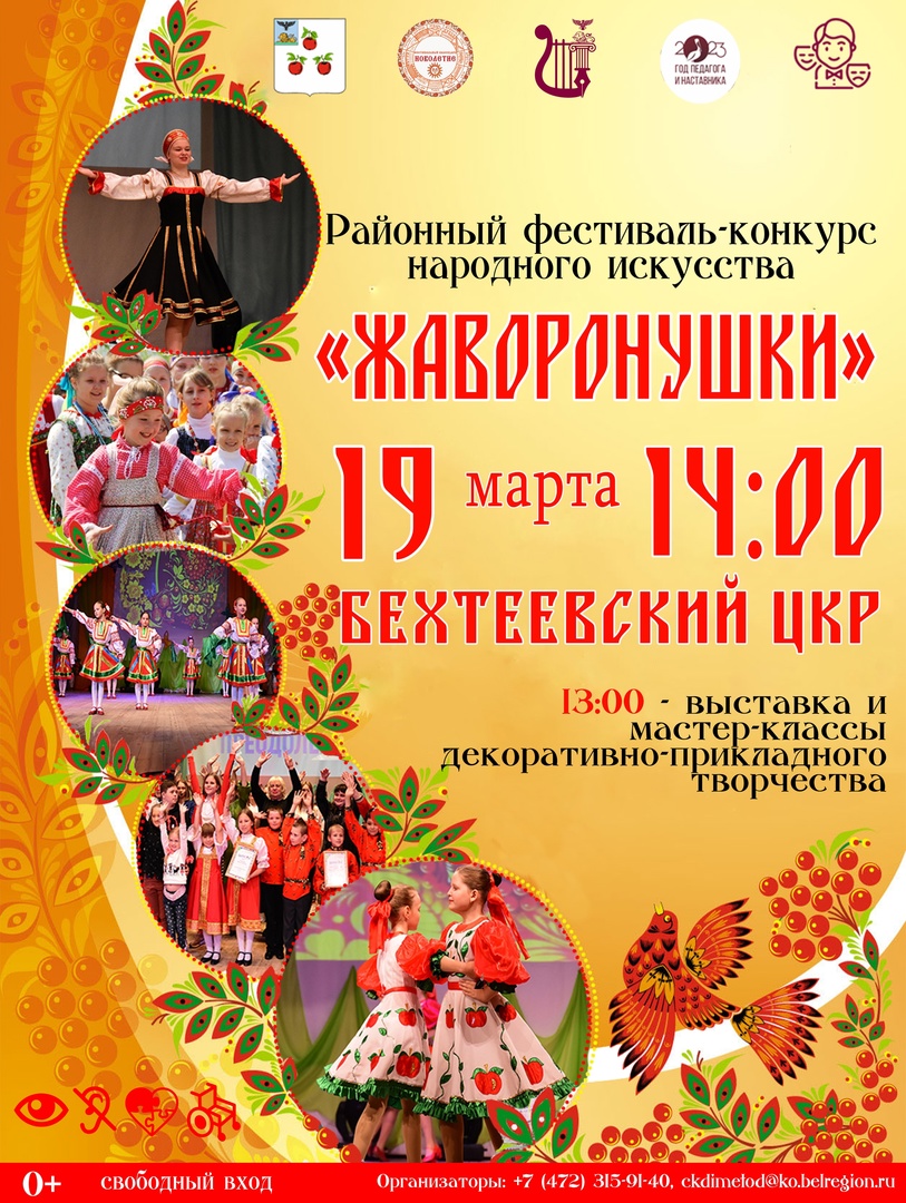 ПРИГЛАШАЕМ ВСЕХ ЖЕЛАЮЩИЙ НА РАЙОННЫЙ ФЕСТИВАЛЬ-КОНКУРС НАРОДНОГО ИСКУССТВА «ЖАВОРОНУШКИ», КОТОРЫЙ СОСТОИТСЯ 19 МАРТА 14:00 В БЕХТЕЕВСКОМ ЦЕНТРЕ КУЛЬТУРНОГО РАЗВИТИЯ.
