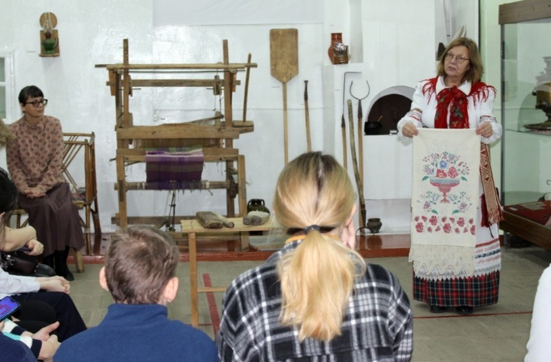 Хозяйка познакомила посетителей с устройством крестьянской избы, рассказала о занятиях рукоделием, о приготовлении пищи в печи. Гости узнали, что бельё раньше колотили и катали, и сами попробовали поработать по-старинке.