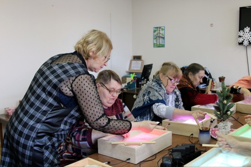 Губкинские пенсионеры посетили занятие по рисованию песком «Зимнее чудо»