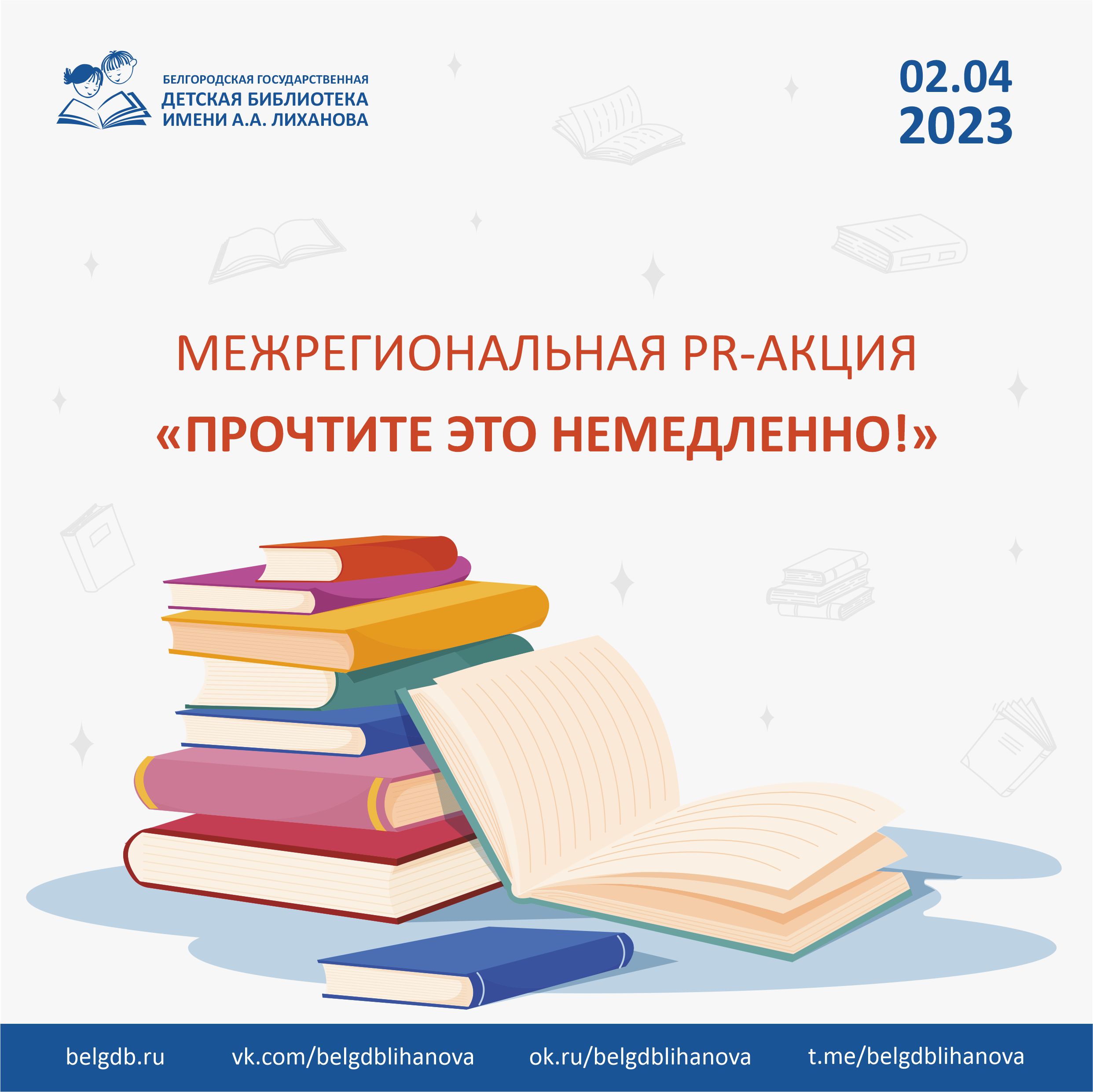 Фото-отчёт присылать в сообщения нашего официального сообщества ВКонтакте: https://vk.com/belgdblihanova , видео на адрес электронной почты: [email protected] с хэштегом #Чтение31 #Прочтитеэтонемедленно