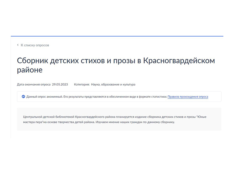 Уважаемые красногвардейцы! Появилась возможность узнать мнение жителей через Платформу обратной связи. Приглашаем вас пройти опрос на тему: издание сборника детских стихов и прозы «Юные мастера пера» на основе творчества детей района.