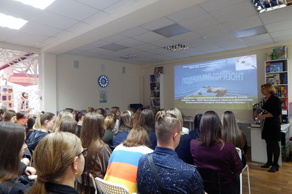 В модельной детской библиотеке-филиале №15 прошла встреча «Поднимая горизонт» с учителем русского языка и литературы, победителем в номинации «Лучший учитель» в региональном этапе Всероссийского конкурса «Учитель года России – 2022» и финалистом федерального этапа Сорокиной Натальей Александровной и будущими педагогами начальных классов и дошкольного образования – студентами Белгородского педагогического колледжа, организованная сотрудниками библиотеки в рамках Года педагога и наставника.