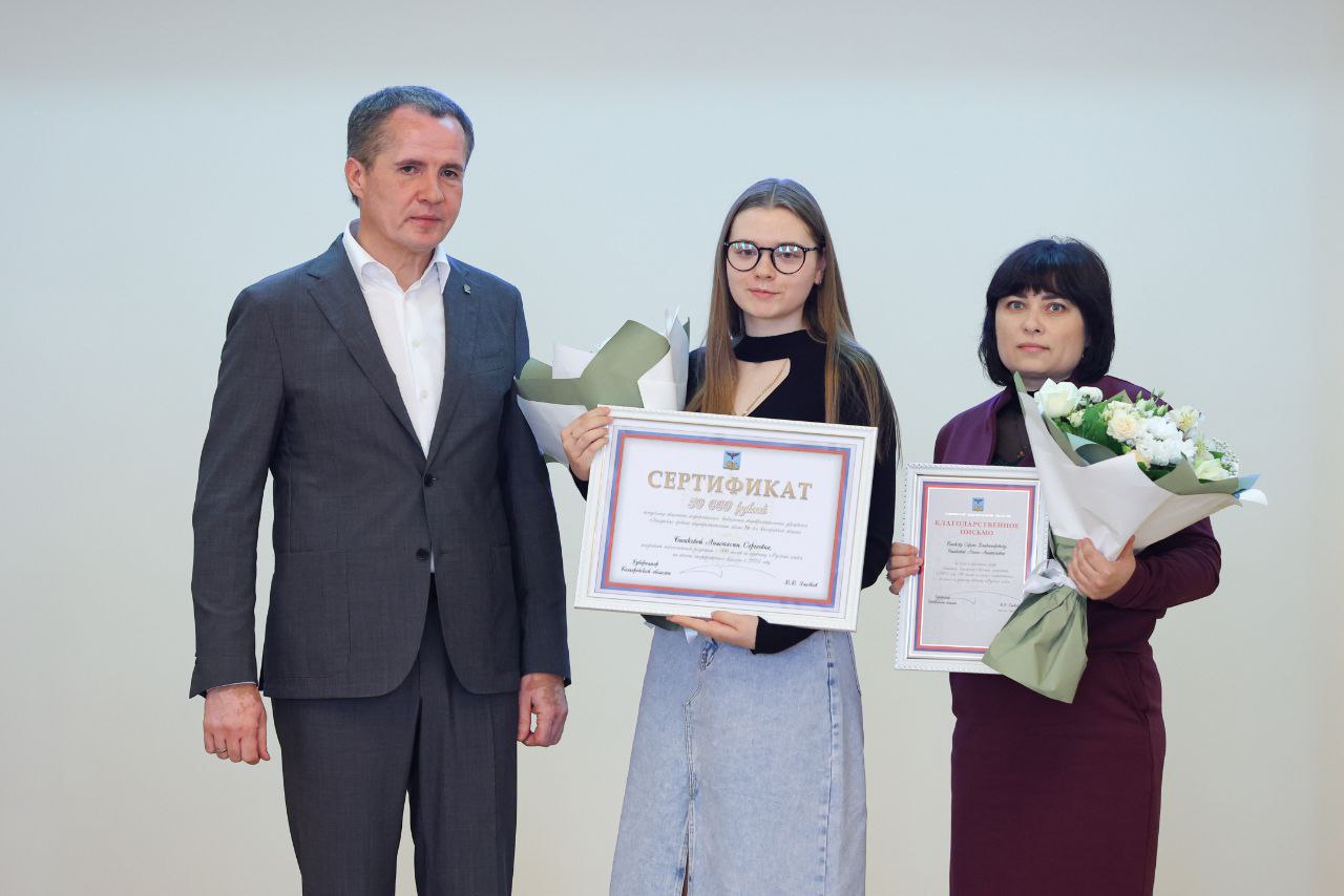 Премией Губернатора Белгородской области поощрены выпускники ОГБОУ «Валуйская СОШ №4» Белгородской области Биткова Анастасия и Пархоменко Егор, набравшие по 100 баллов на ЕГЭ по предмету «Русский язык».