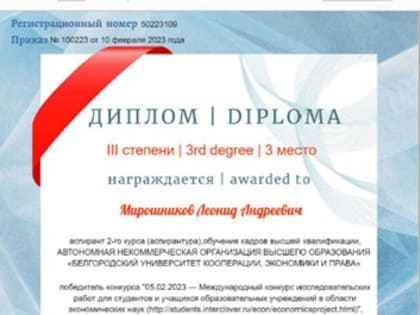 Поздравляем аспиранта кафедры экономики с заслуженной победой в конкурсе