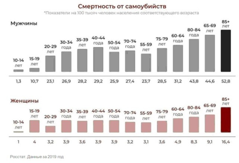 Частота самоубийств наиболее высока среди лиц старше 70 лет - как среди мужчин, так и среди женщин. В старшем возрасте возникает усталость от жизни, одиночество, тяжелые соматические заболевания.