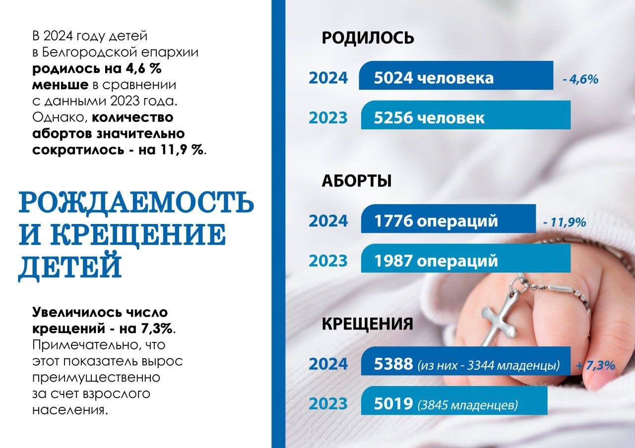 Белгородская и Старооскольская епархия подвела итоги по рождаемости и крещению детей, а также по бракам и разводам за 2024 год. Так, в 2024 в Белгородской епархии родились 5 024 ребёнка — на 4,6 процента меньше, чем в прошлом году, когда на свет появилось 5 256 малышей . При этом количество абортов сократилось на 11,9 процента — в 2024 их было проведено 1 776 , а в 2023 — 1 987 .