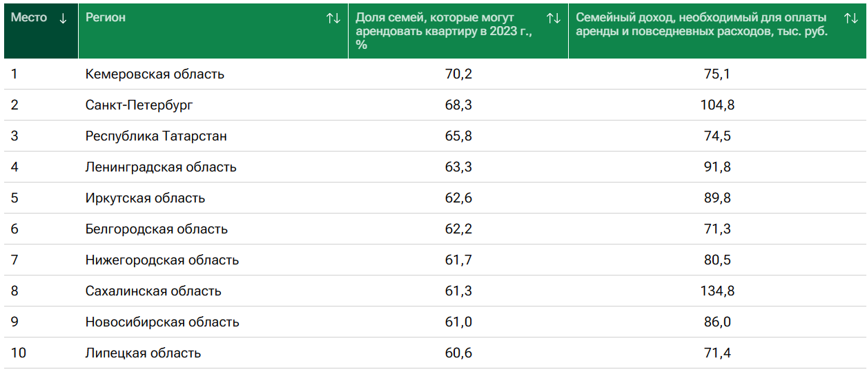 — Доступность аренды жилья в российских регионах определяется долей семей, которые могут арендовать типовую двухкомнатную квартиру. Предполагается, что в семье двое взрослых и двое детей. 70 процентов средств, оставшихся после вычета из семейного бюджета прожиточных минимумов, она тратит на аренду жилья, 30 процентов — на прочие расходы. Доля семей, которые могут оплачивать съёмную квартиру и повседневные расходы, рассчитана на основе оценки процентного распределения работающих по величине зарплат в регионе. Арендные ставки и прожиточные минимумы взяты за 2023 год индивидуально для каждого субъекта федерации, — поясняют исследователи.В тройку регионов-лидеров по этому показателю вошли Кемеровская область, Санкт-Петербург и Республика Татарстан. Там аренда доступна свыше 65 процентам жителей. При этом сложнее всего с временной квартирой или домом дела обстоят в Ингушетии, Дагестане и Кабардино-Балкарской Республике.