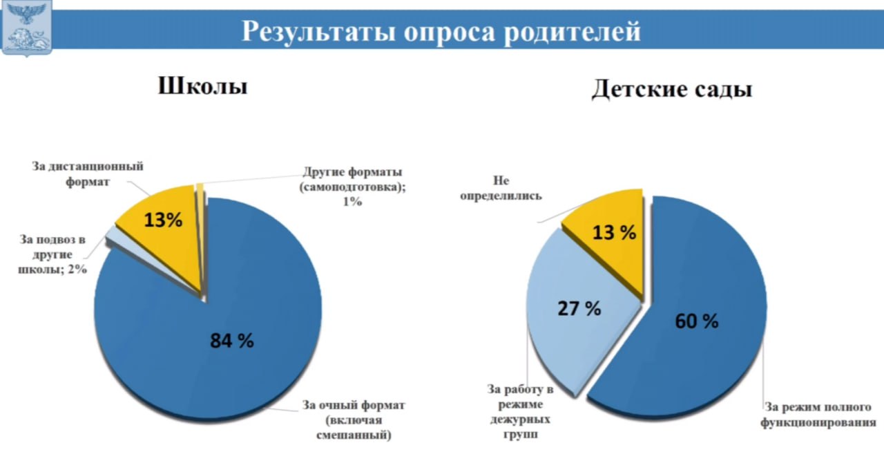На оперативном совещании правительства презентовали итоги голосования родителей за формат обучения в Белгородской области. В итоге 84 процента респондентов выступили за возвращение в школу или смешанную форму обучения. 60 процентов высказались за постоянную работу детских садов.