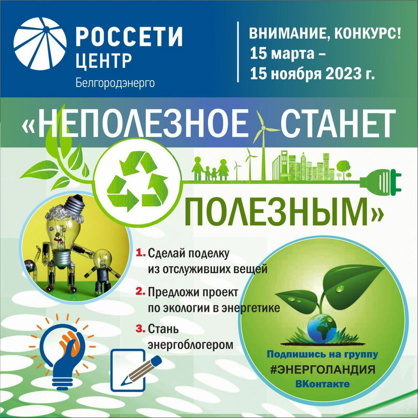 Филиал «Россети Центр» — «Белгородэнерго» приглашает детей и подростков поучаствовать в конкурсе «Неполезное станет полезным!». Цель творческого состязания — сформировать у подрастающего поколения бережное и созидательное отношение к окружающему миру, напомнить о роли энергетики в охране окружающей среды, побудить участников к проектной деятельности и нестандартному решению задач по экологии.