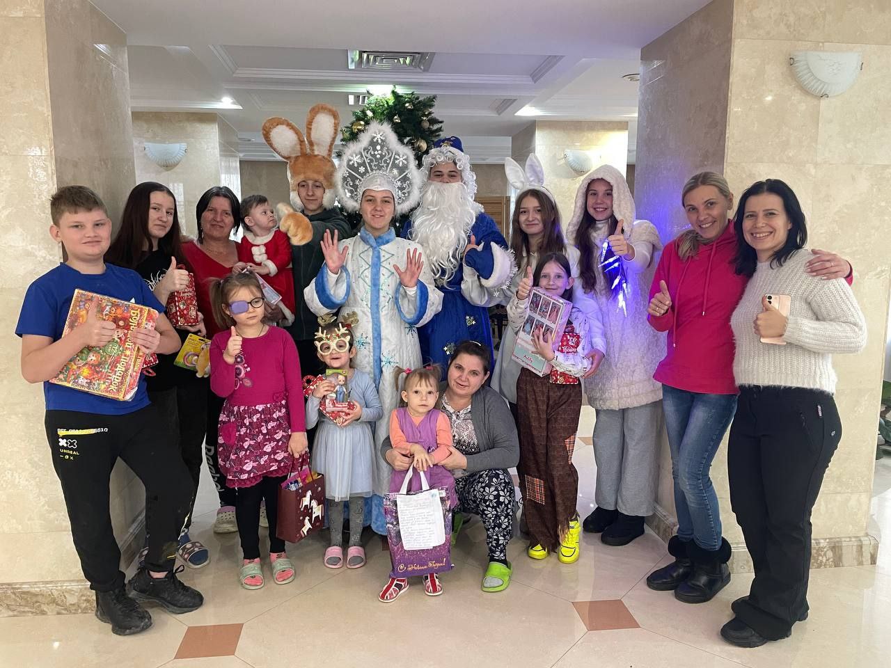Волонтёры Центра помощи Юлии Немчиновой поздравили с Новым годом детей в пунктах временного размещения. Активисты подготовили подарки и развлекательную программу для многодетных семей и детей с инвалидностью. В этом им помогли школьники из отряда добровольцев «Алгоритм добра», которые надели костюмы Деда Мороза и Снегурочки.