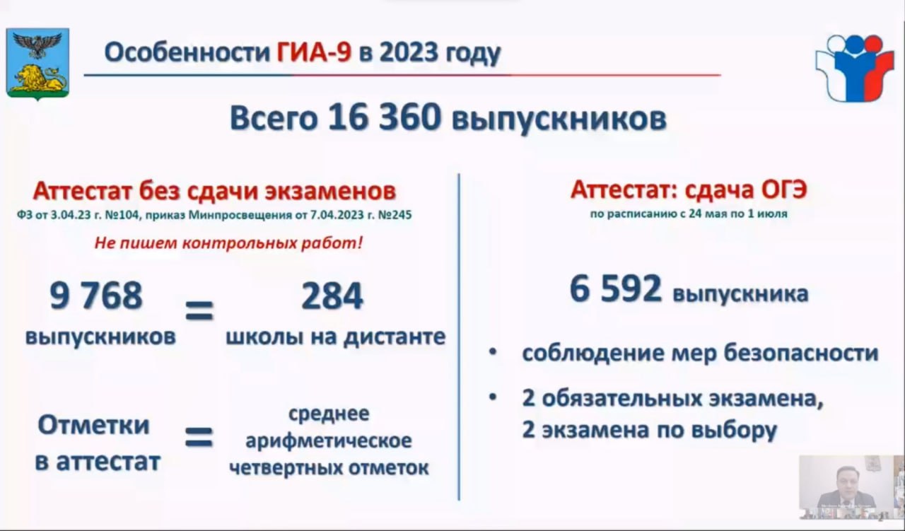 Скриншот слайдов с совещания облправительстваОдиннадцатиклассники «на удалёнке» могут выбрать: получить аттестат без ЕГЭ, а потом сдавать экзамены про поступлении в университет, или же сдать единый госэкзамен и предоставить его результаты для поступления. Определиться с формой аттестации должны 3,2 тысячи юношей и девушек. Также по поручению губернатора в регионе заработает «горячая линия» с круглосуточным телефоном о новом порядке итоговой аттестации школьников. Напомним, что в белгородских школах летом 2023 года не будет дневных лагерей в связи с СВО.