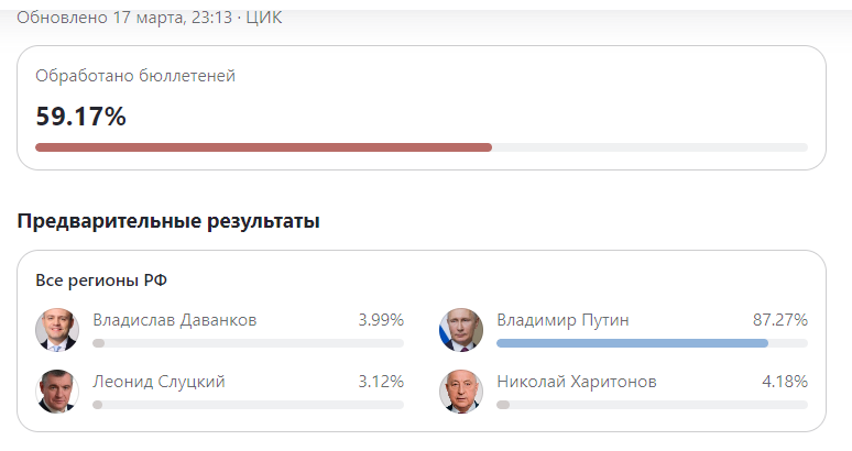 При этом по данным на 23:13 после подсчёта 59,17 процента голосов по стране на первом месте идёт самовыдвиженец Владимир Путин с результатом 87,27 процента, на втором — Николай Харитонов от КПРФ с 4,18 процента голосов, а на третьем — Владислав Даванков из партии «Новые люди» с 3,99 процента.