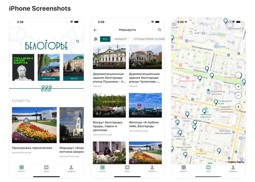 Пока у приложения рейтинг пять из пяти баллов. Для изучения доступны фототур «Я люблю тебя, Белгород», автотур «Вокруг Белгорода: пруды, парки и урочища», пеший тур о дореволюционных зданиях Белгорода и другие.