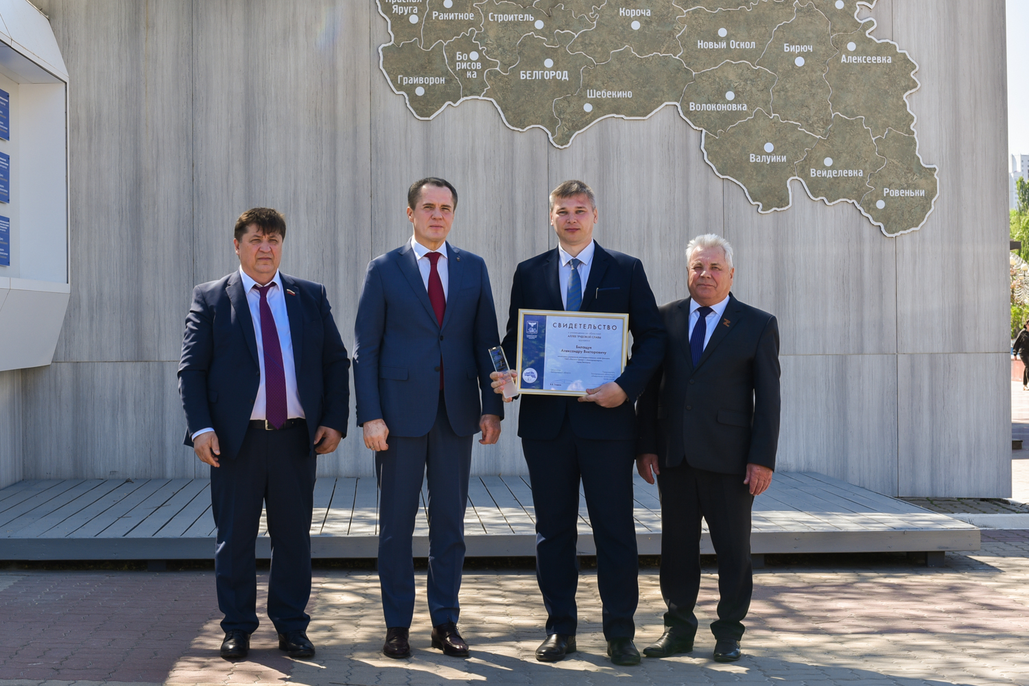 Имя начальника управления распределительных сетей филиала «Россети Центр» — «Белгородэнерго» Александра Билащука появилось на Аллее Трудовой Славы Белгородской области. Почётное свидетельство ему вручили губернатор Белгородской области Вячеслав Гладков, председатель областной думы Юрий Клепиков и председатель Белгородского объединения организаций профсоюзов Николай Шаталов. Это произошло в преддверии Дня Весны и Труда, сообщает телеграм-канал «Информбюро».