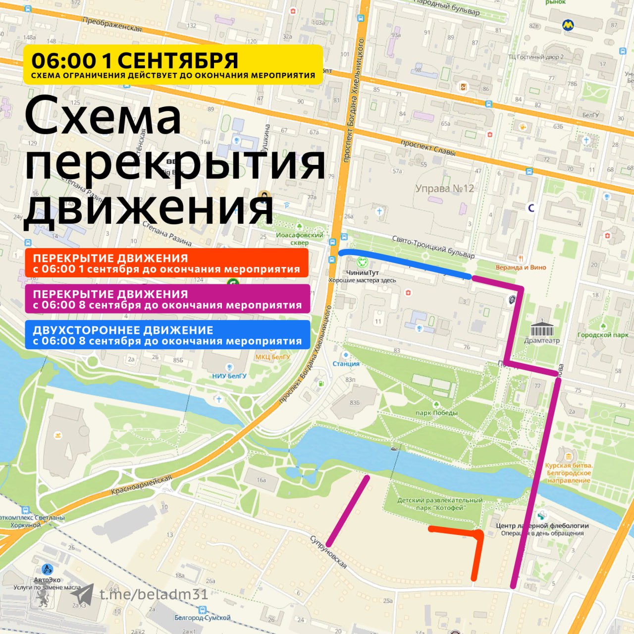 Из-за проведения ежегодного фестиваля «Белгород в цвету» в центре города ограничат движение транспорта, причём некоторые ограничения действуют уже с 1 сентября. Мэрия сделала карточки, где указала все участки, где будет проблематично припарковаться или проехать с 8 до 10 сентября.