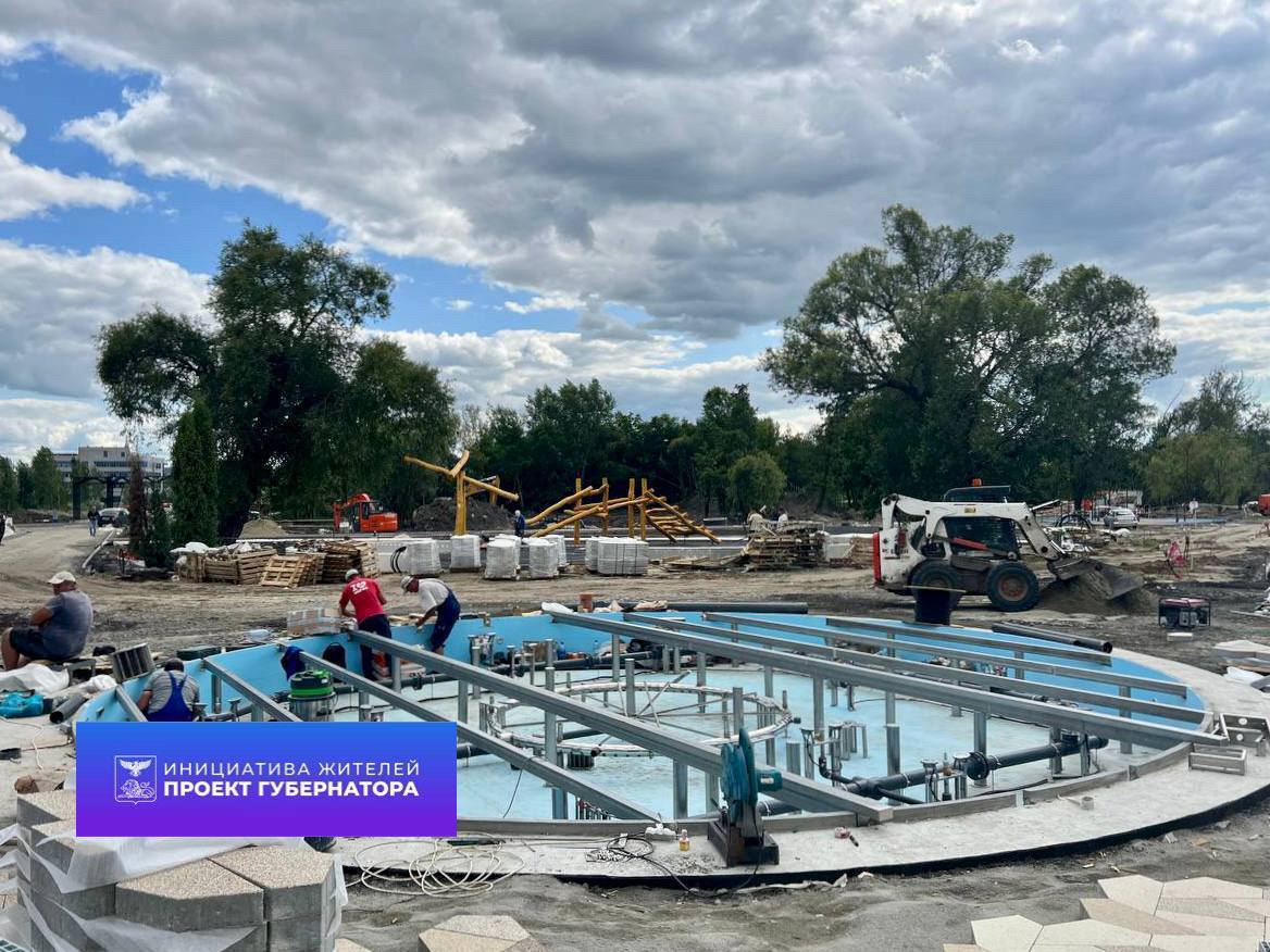 — Строители обустроили большую часть пешеходных маршрутов и велодорожек, все коммуникации, опорные стены, которые используются для зонирования. Готов ключевой элемент — фонтан. Вокруг него завершают мощение плиткой. На объект зашли озеленители — оформляют клумбы, высаживают деревья, газоны. Системы капельного и автоматического полива смонтированы. Побережье отсыпано белым песком, — написал Демидов в своём телеграм-канале.Фото из телеграм-канала Валентина Демидова