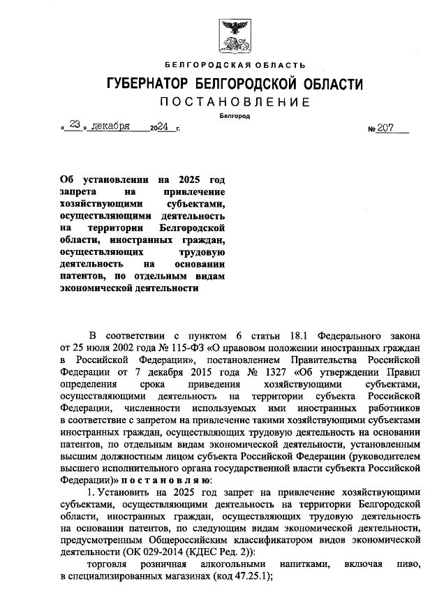 — Установить на 2025 год запрет на привлечение хозяйствующими субъектами, осуществляющими деятельность на территории Белгородской области, иностранных граждан, осуществляющих трудовую деятельность на основании патентов по отдельным видам экономической деятельности, предусмотренным Общероссийским классификатором видов экономической деятельности, — говорится в документе.Мигрантам запретят заниматься розничной продажей алкогольных напитков в специализированных магазинах, пассажирскими перевозками в городском и пригородном сообщении, работать в такси и аренде легковых автомобилей с водителем. Также под запрет попадёт работа в сфере предоставления продуктов и напитков .