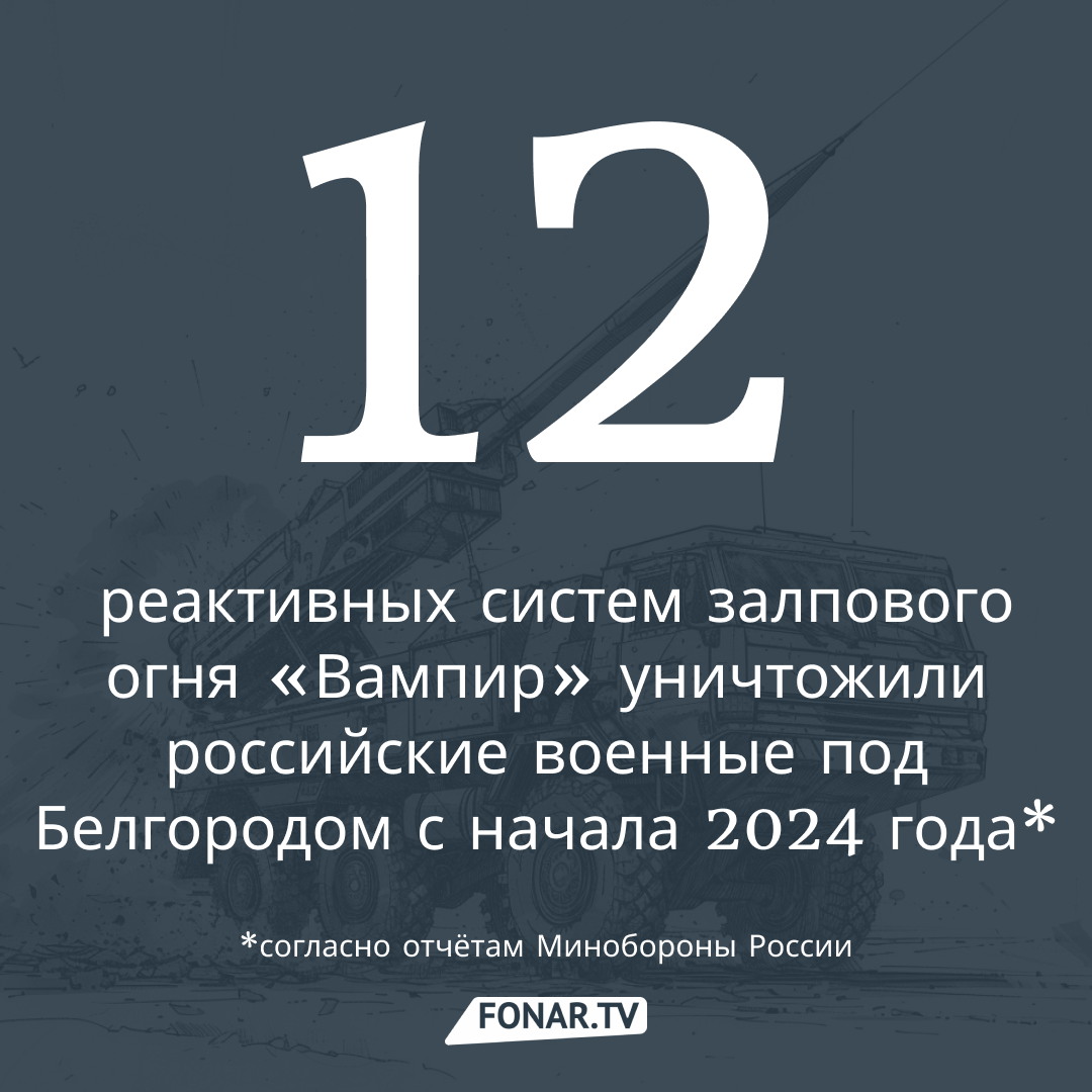 Журналисты ИА «Бел.Ру» с помощью сводок Минобороны РФ подсчитали, сколько установок «Вампир» уничтожили российские военные с начала года Белгородском направлении. Согласно данным, первые сведения о поражении «Вампиров» на белгородском направлении появились ещё в марте. За тот месяц российские военные вывели из строя шесть РСЗО , в апреле сведений об уничтожении не поступало, а в мае, после начала действий Армии России на харьковском направлении, выявленными и уничтоженными оказались ещё шесть установок . Итого с начала года российские военные уничтожили 12 установок РСЗО .
