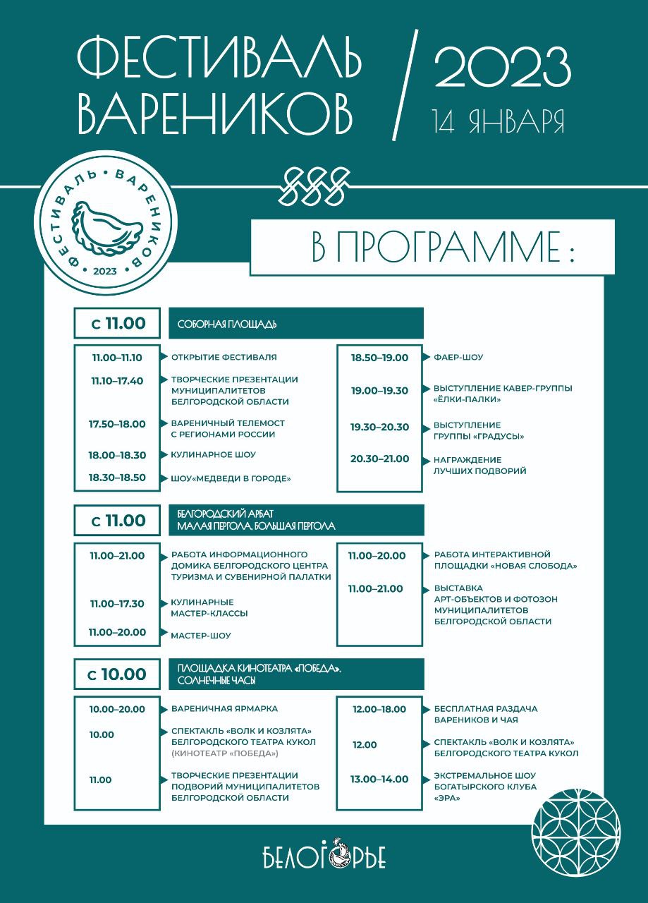 Сам праздник вареников начнётся в 10:00. Организаторы запланировали «варенечный телемост» с регионами России, кулинарное шоу, творческие презентации муниципалитетов и бесплатную раздачу вареников и чая (возле Солнечных часов на Центральном рынке — прим. Ф.) . Детям тоже будет что посмотреть и чем развлечься. С 10 часов возле кинотеатра «Победа» покажут спектакль «Волк и козлята», а в 18:30 на площади будет шоу «Медведи в городе».