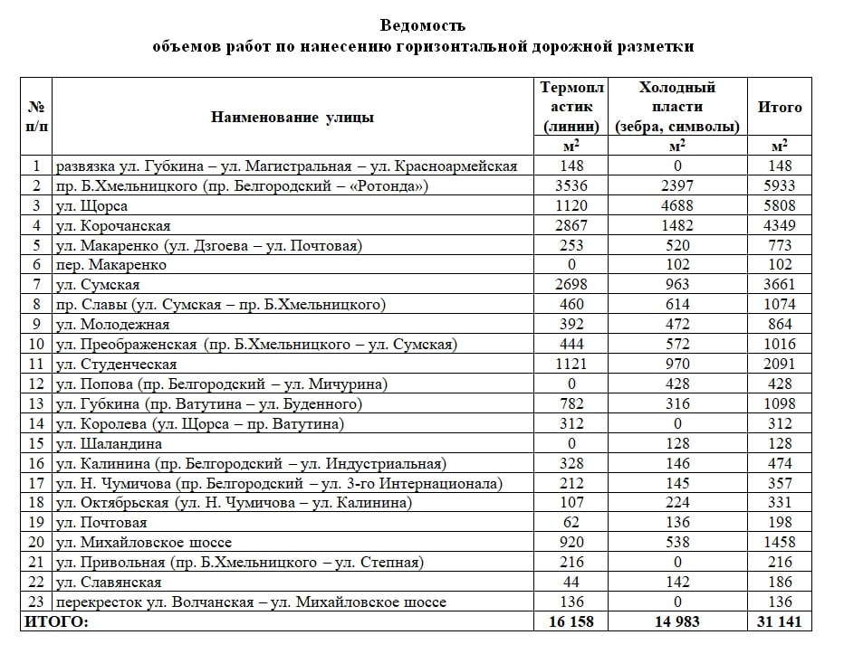 В качестве материала для нанесения разметки будут использовать холодный пластик и термопластик, соответствующие ГОСТам. Также в документе есть перечень улиц, где обновится разметка. Это ключевые магистрали в центре города, участки на Харьковской горе, на Крейде и другие территории.