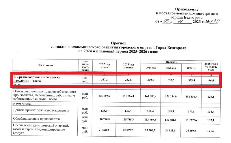 Мэрия Белгорода опубликовала новый прогноз развития города на ближайшие три года. На него обратили внимание журналисты «Открытого Белгорода» . На начало 2023 года население областного центра сократилось примерно на 6,6 тысячи жителей и сейчас составляет 332,5 тысячи человек . Это чуть больше 98 процентов, если сравнивать с 2022 годом. Переломить тенденцию с постепенным уменьшением числа жителей пока не удаётся: по прогнозу чиновников к 2026 году количество жителей города уменьшится ещё больше и достигнет 325,5 тысяч человек.