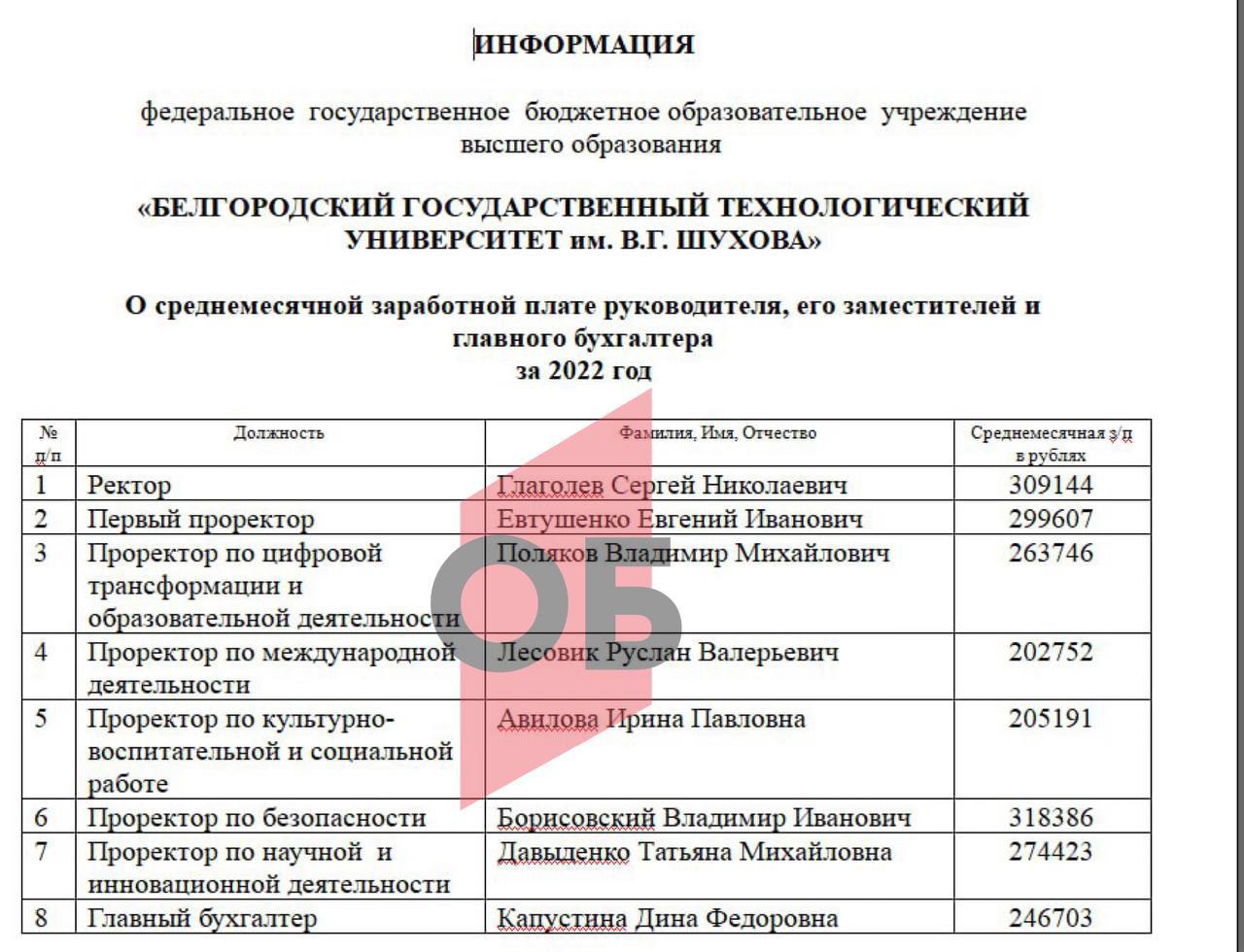 «Открытый Белгород» опубликовал данные о размере зарплаты руководства НИУ «БелГУ» и БГТУ имени Шухова за 2022 год. Ректор «Технолога» Сергей Глаголев ежемесячно получал чуть больше 309 тысяч рублей. Что интересно: проректор по безопасности Владимир Борисовский имел больший оклад — 318 тысяч рублей. Остальным проректорам, включая главного бухгалтера, начисляли зарплаты за 200 тысяч рублей.