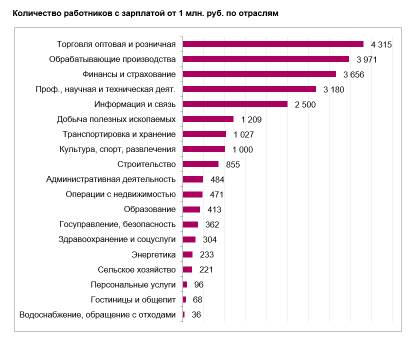 — Больше всего работников-миллионеров трудится в сфере оптовой и розничной торговли — 4,3 тысячи человек, в обрабатывающей промышленности — 3,97 тысячи человек, в финансах и страховании — 3,66 тысячи человек, в сфере профессиональной, научной и технической деятельности (сюда относятся юриспруденция, консалтинг, инженерно-техническое проектирование, научные исследования и разработки, маркетинг) — 3,18 тысячи человек, а также в области информации и связи (сфера IT, телекоммуникации, телевидение и радио, издательская деятельность) — 2,5 тысячи человек, — пишут аналитики.Недавние цифры Белгородстата говорят о том, что самыми обеспеченными в регионе считаются работники отрасли информации и связи, которые могут получить в среднем около 115 тысяч рублей. На втором месте — представители сферы финансов и страхования. Их зарплата — около 82 тысяч рублей, на третьем — работники сельского хозяйства и лесники, а также рыболовы — 72 тысячи рублей. По данным статистиков также неплохо — 56 тысяч рублей — приносят домой те, кто занят в энергетике, науке, строительстве, государственном управлении, логистике и обрабатывающем производстве.