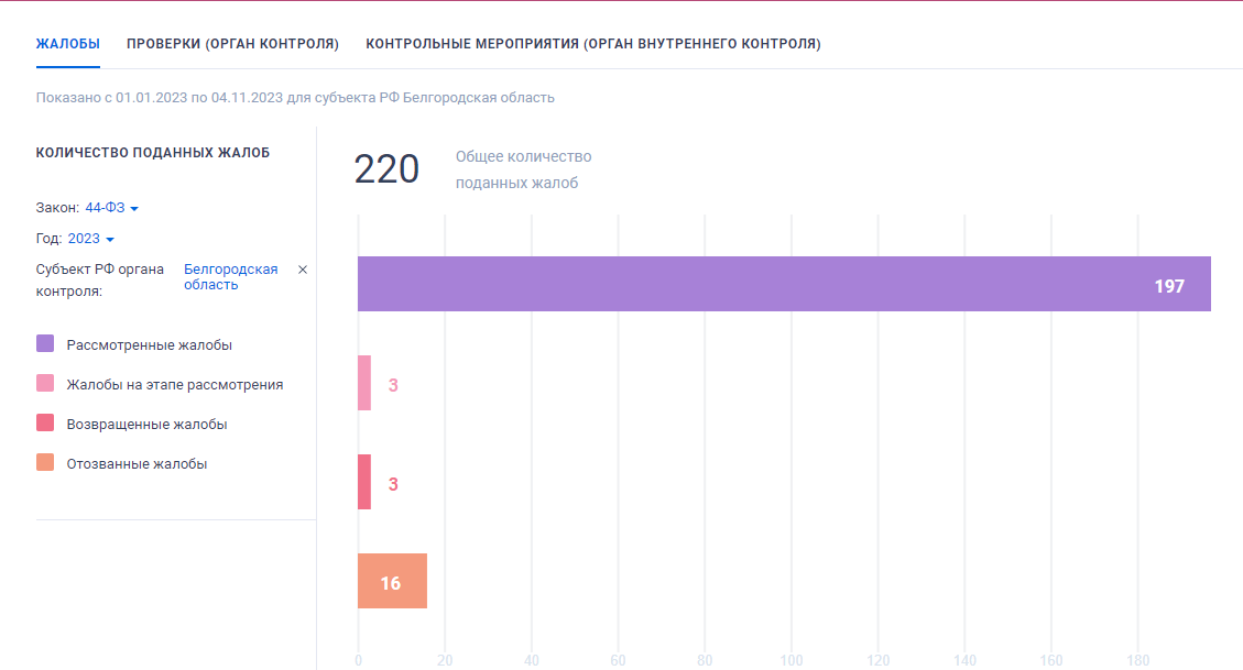 На наш вопрос, были ли у контролирующих органов претензии к госзакупкам администрации Белгорода и подконтрольных предприятий в 2022 и 2023 годах и был ли кто-то за это наказан, пресс-служба администрации направила нас на сайт госзакупок, где есть только общая информация о жалобах по региону и информация о результатах деятельности органов аудита в сфере закупок. Судя по размещённым данным, последняя проверка КСП Белгорода была в 2022, и тогда проверялись только семь городских детско-юношеских спортивных школ, в которых нашли 36 нарушений на 520 тысяч рублей.