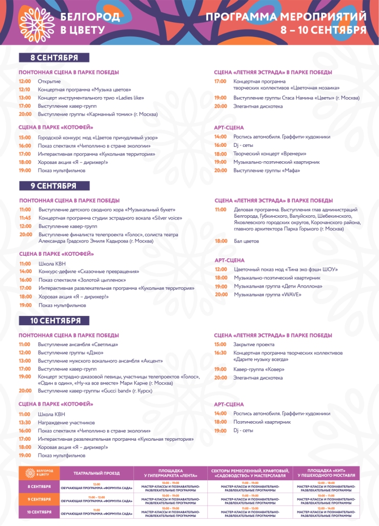 За несколько дней до фестиваля «Белгород в цвету» власти опубликовали его афишу, чтобы белгородцы могли выбрать, куда отправиться с 8 по 10 сентября. Все события развернутся на четырёх главных площадках: на новой большой понтонной сцене, на сцене «Лентняя эстрада» в парке Победы, у парка «Котофей» и арт-сцене.
