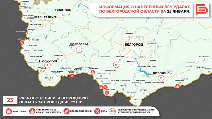 В Белгородском районе по селу Щетиновка выпущено 8 артиллерийских снарядов, по селу Журавлевка – 2, по МАПП «Нехотеевка» – 6 артиллерийских снарядов. Также МАПП «Нехотеевка» атакован двумя дронами-камикадзе. В селе Журавлевка противник атаковал с помощью одного дрона-камикадзе. В данных населенных пунктах пострадавших и разрушений нет. После отражения средствами ПВО воздушной атаки ВСУ на 25 января повреждения выявлены в поселке Разумное – в одном частном жилом домовладении повреждена крыша, в селе Таврово в одном частном доме выбиты окна.
