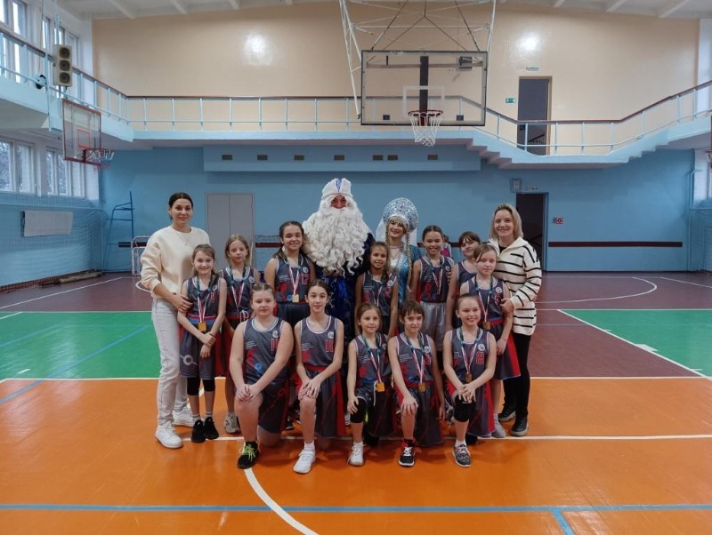 На награждение к юным баскетболисткам пожаловали Снегурочка и Дед Мороз. Они поздравили всех участниц соревнований c Новым годом и пожелали исполнения всех желаний.
