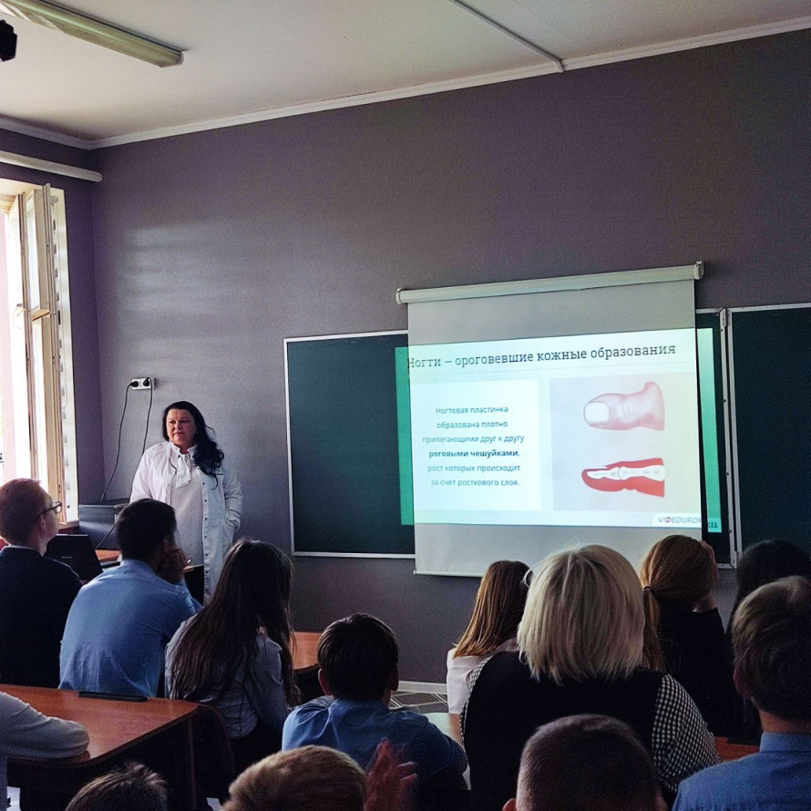 Для учащихся 6-8 классов был проведен Урок здоровья на тему «Здоровье кожи». Ребята узнали о строении и функции кожи, ее типах, о профилактике кожных заболеваний, а также о том, как соблюдать гигиену кожных покровов.